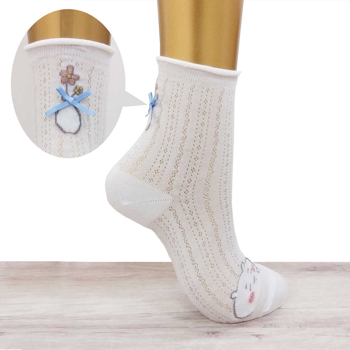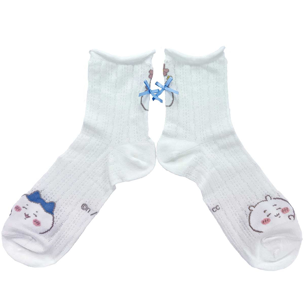 ちいかわとハチワレの思い出の褒められリボンがレッグ後部分に配置されたクルーソックス。